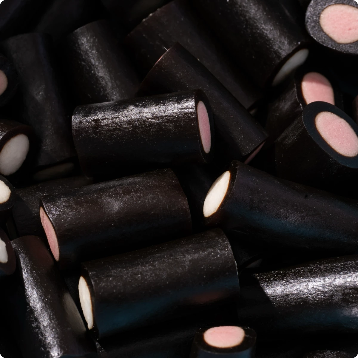 INGREDIENTI: Zucchero, melasso di canna, farina di frumento, sciroppo di glucosio, acqua, estratto di liquirizia, polvere di liquirizia (estratto di liquirizia, zucchero), grasso vegetale di cocco, cloruro d’ammonio, fecola di patate modificata, amido di mais modificato, stabilizzatore: E420; olio di cocco, aroma naturale di anice, emulsionante: E471. Contiene glutine.