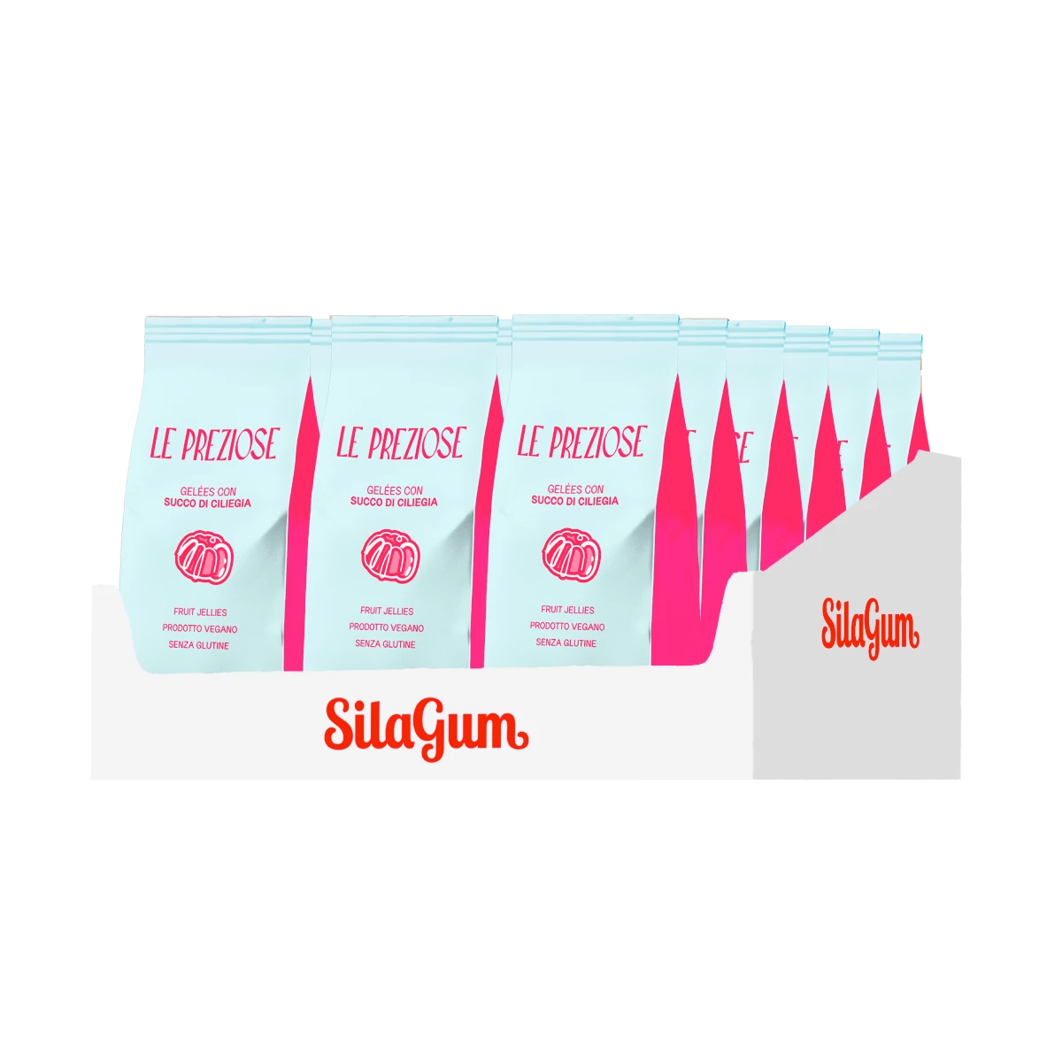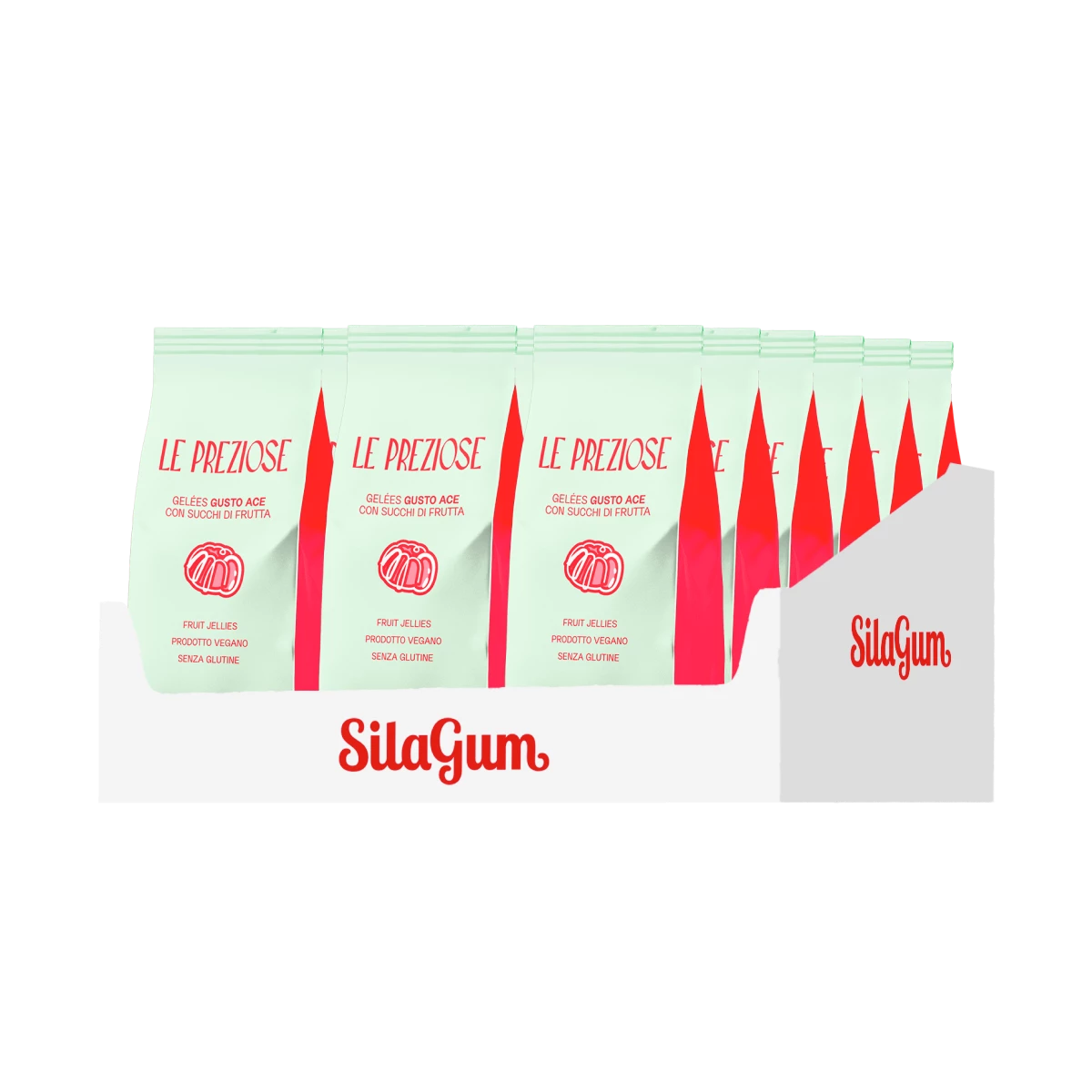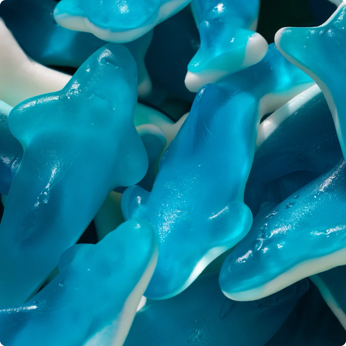 Sciroppo di glucosio, zucchero, gelatina alimentare, destrosio. Acidificante: acido citrico. Aromi naturali. Colorante: E131. Olio vegetale (cocco). Agenti di rivestimento: cera carnauba (E903). Glucose syrup, sugar, foodstuff gelatine, dextrose. Acidifier: citric acid. Natural flavourings. Colorante: E131. Vegetable oil (coconut). Coating agents: carnauba wax (E903).